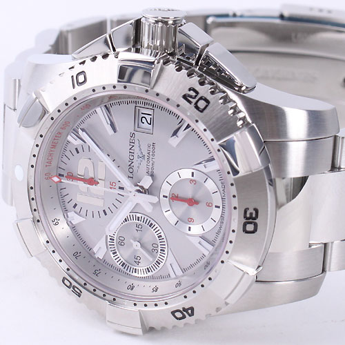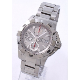 存在感ある直径41mmのシルバーステンレスケース。シルバー文字盤に蛍光塗料を施した同色の指針、ア ラビアとバーインデックスを配置。12時位置に30分計、3時位置に日付表示、ブランドロゴとオートマチックであることを示す刻印、6時位置に12時間 計、9時位置にスモールセコンド(秒針用のダイヤル)を搭載。文字盤内周にはスピードや平均時間を簡単に算出出来るタキメーター機能を搭載。