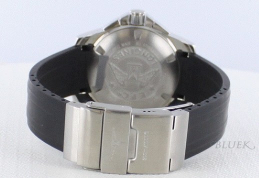 「極めて優れた」ダイビングウォッチ。HydroConquestシリーズは、海を制することにひたむ きな方や海に情熱を傾ける方にとって欠かせない存在と言えます。水の世界で遭遇する過酷な状況に対応しており、300m防水で、逆回転防止回転ベゼル、ね じ留め式ケース、ねじ込み式リューズとその側面を保護するリューズプロテクター、ダイビング用一体型延長ピース付き二重安全フォールディングクラスプを備 えています。このように妥協のない安全を実現する確実な保証は、静寂に包まれた水の世界と完璧に調和しています。パフォーマンスとエレガンス。ロンジンな らではのコンビネーションです。マリンを思わせるブルーの文字盤にレッドのアクセントがハイセンス。ブラックのラバーベルトを採用した本格ダイバーウォッ チです。裏蓋にはロンジンEFCゴールデンウィングのエンブレムが刻印されています。