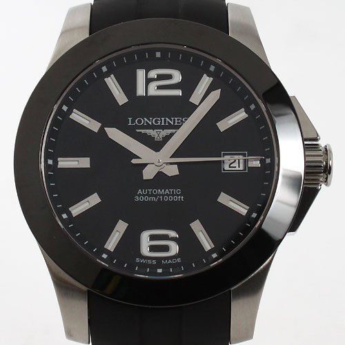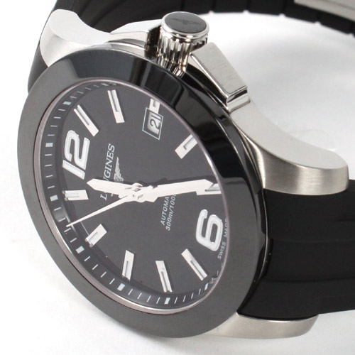 ブラック文字盤にシルバーの指針、アラビアとバーインデックスを配置。12時位置にブランドロゴ、3時位置に日付表示、6時位置にオートマチックであることを示す刻印。ベゼルにはセラミックベゼルを採用。