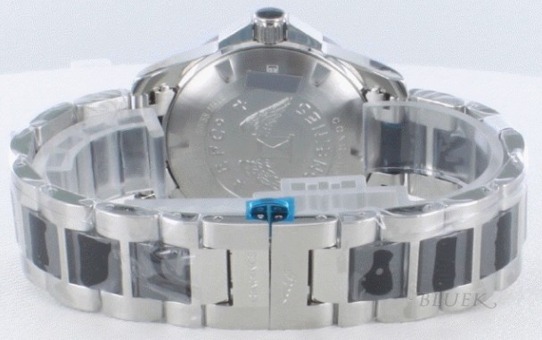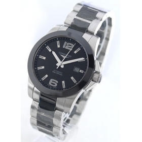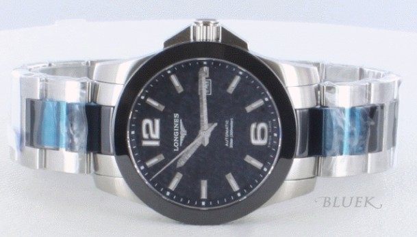 ミラーボ ディに艶やかなブラックセラミックベゼルやマットなブラック文字盤が浮かび、ブラックセラミックを組み込んだ3連ブレスでクールスタンダードにまとめたコ ンクエストです。ビックフェイスには光沢あるアラビア・バーインデックス、太い指針が視認性に優れ存在感抜群。リューズガードもしっかりと、必要な機能だ けを搭載した日常使いにも最適な時計です。
