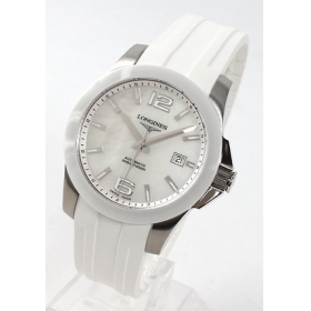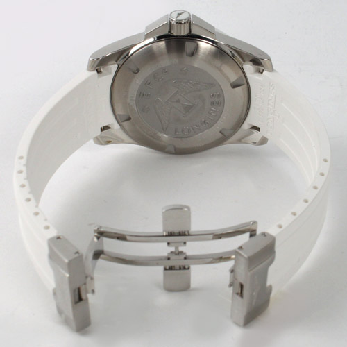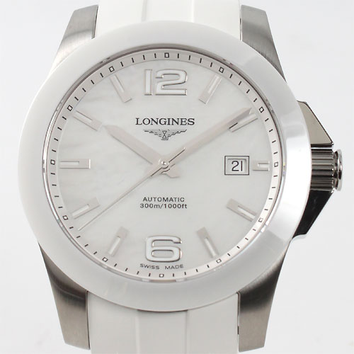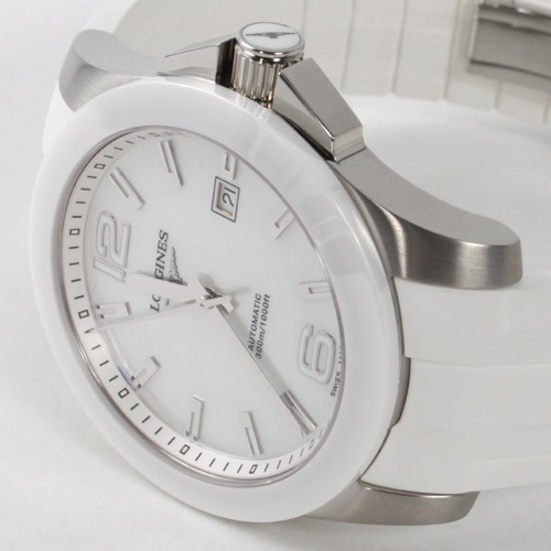 直径40mmを超える存在感があるケース。ホワイトシェル文字盤にシルバーの指針、アラビアとバーインデックスを配置。12時位置にブランドロゴ、3時位置に日付表示、6時位置にオートマチックであることを示す刻印。ベゼルにはセラミックベゼルを採用。