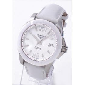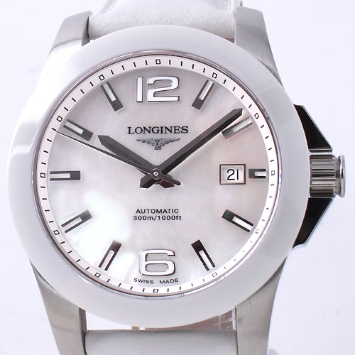 存在感ある直径41mmのシルバーステンレスケース。ホワイトシェル文字盤にシルバーの指針、アラビアとバーインデックスを配置。12時位置にブランドロゴ、3時位置に日付表示、6時位置にオートマチックであることを示す刻印。ベゼルにはセラミックベゼルを採用。