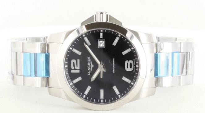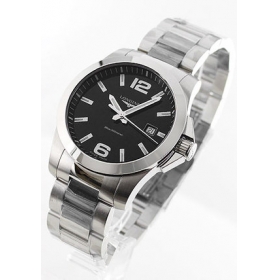 シンプルなのに、鮮やか。スポーティなのにエレガント。そんないくつもの魅力を兼ね備えているのが、こ の300m防水機能を搭載したコンクエストです。41ミリケースに組み合わせたブラックダイヤルと、サテン&ポリッシュで仕上げられたステンレス3連ブレ スとの相性も抜群。男らしさを感じさせる力強さと、都会的な洗練された印象が広がります。ダイヤルには12、6時のアラビア数字のみ大きく配して視認性と 見事なデザインバランスを確保。ブラックに映えるシルバーの意匠が非常に格好いい、できる男によく似合う一本です。
