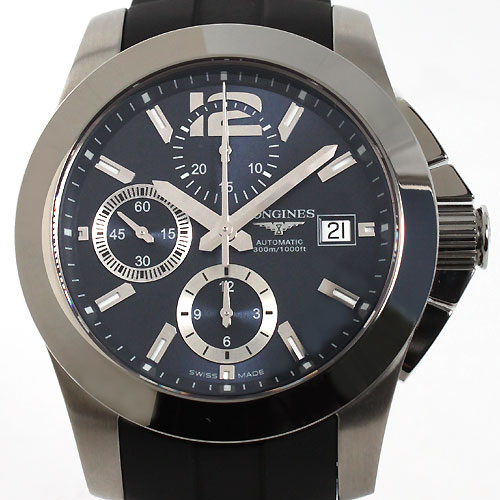直径40mmを超える存在感があるケース。ダークブルー文字盤にシルバーの指針、アラビアとバーイン デックスを配置。12時位置に30分計、3時位置にブランドロゴ、日付表示、オートマチックであることを示す刻印、6時位置に12時間計、9時位置にス モールセコンド(秒針用のダイヤル)を搭載。