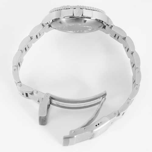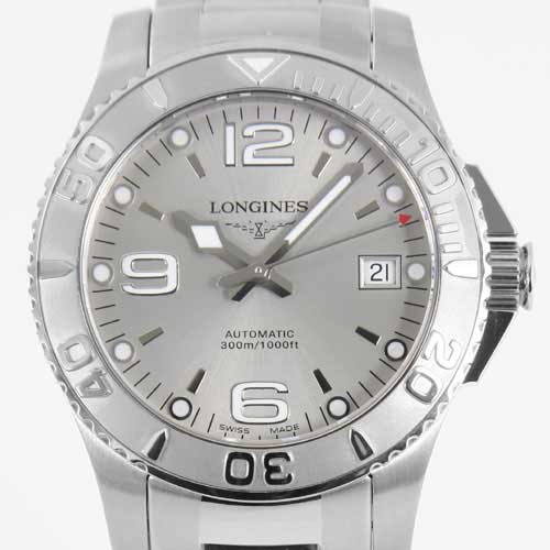シルバー文字盤に蛍光塗料を施した同色の指針、バーとドットのインデックスを配置。12時位置にブランドロゴ、3時位置に日付表示、6時位置にオートマチックであることを示す刻印。