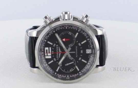 ブラックフェイスのギョーシェ模様にすっきりとしたベゼルが男クラシカルで、白スティッチ入りアリゲー ターブラックレザーがシックなカジュアル感をプラスしたクロノグラフです。ブラック文字盤には12時インデックスや空を翔るパイロットの様なレッドの秒針 がアクセントとなり、世界の時を担う厚さ15mmのごつさが心地よくフィット。横並びインダイヤルがスポーティさをプラス。蛍光塗料を施したシルバー指針 やアラビア・バーインデックスは空の上でも視認性に富みます。大型のリューズやプッシュボタンもパイロットウォッチには欠かせない、世界の空を舞う男のア イテムです。