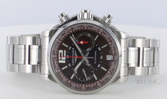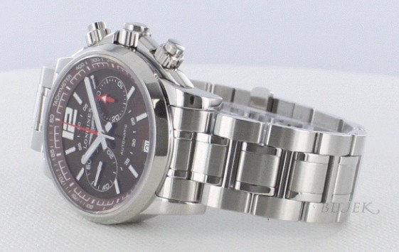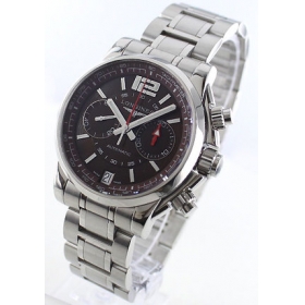 一部ギョーシェ模様入りブラウン文字盤が珍しくモダンに42mmのビックフェイスに厚さ15mmの存在 感は圧倒的で、3連ブレスがスポーティなウォッチです。すっきりとしたベゼルがどこかクラシカルに、ブラウンフェイスの強い光沢の上で主張する秒針は赤く インパクト。蛍光塗料を施した太いシルバー指針や大型アラビア・バーインデックス、インダイヤルデザインがスピード感を醸し出し暗闇でも視認性に優れま す。6時位置には日付表示。ずっしりとした重量感が男らしくフィットするクロノグラフです。