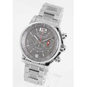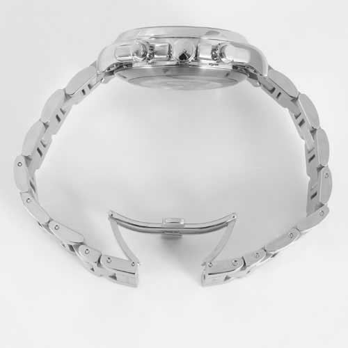 ギョーシェ模様の入ったグレー文字盤に蛍光塗料を施したシルバーの指針、アラビアとバーインデックスを配置。12時位置にブランドロゴ、3時位置に30分計、6時位置に日付表示とオートマチックであることを示す刻印、9時位置にスモールセコンドを搭載。