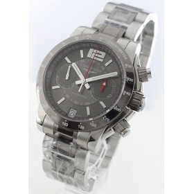 グレーのセラミックベゼルや文字盤、セラミックを組み込んだ3連ブレスが疾風のごとくアクティブスピー ディな多機能クロノグラフです。ごついフェイスでは大型の12時インデックスやレッドの針がアクセント。蛍光塗料を施したアラビアインデックスや指針は視 認性に富みます。42mmのビックフェイスで厚さ15mm、205gの圧巻ボディで手元に躍動感を魅せます。