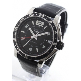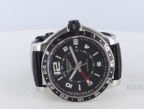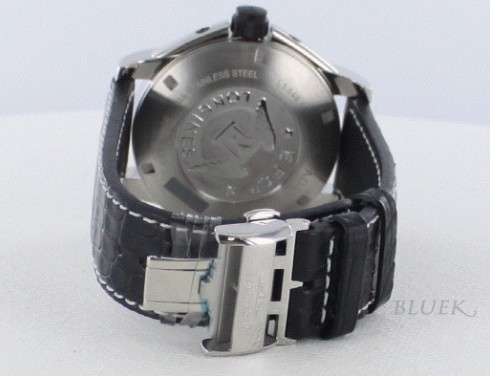 ブラックフェイスにブラックベゼル、白スティッチ入りアリゲーターブラックレザーが力強く男クラシック なGMTウォッチです(世界標準時の事で24時間表示で2箇所以上の時間表示が可能な機能)。ブラック文字盤にはレッドのGMT針がアクセントとなり、世 界の時を担う厚さ15mmのごつさが心地よくフィット。蛍光塗料を施したシルバー指針やアラビア・バーインデックスは空の上でも視認性に富みます。3時位 置にはさりげなく日付表示の、世界の空を舞う男のアイテムです。