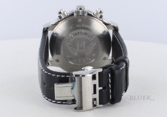 ブラックフェイスにメタリックなシルバーベゼル、白スティッチ入りアリゲーターブラックレザーが男クラ シカルなGMTクロノグラフです(世界標準時の事で24時間表示で2箇所以上の時間表示が可能な機能)。ブラック文字盤には12時インデックスやレッドの GMT針・秒針がアクセントとなり、世界の時を担う厚さ15mmのごつさが心地よくフィット。インダイヤルがスポーティに、蛍光塗料を施したシルバー指針 やアラビア・バーインデックスは空の上でも視認性に富みます。大型のリューズやプッシュボタンもパイロットウォッチには欠かせない、世界の空を舞う男のア イテムです。