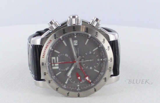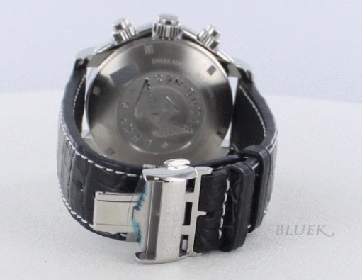 グレーフェイスにブラックベゼルがカジュアルに、白スティッチ入りアリゲーターブラックレザーが男クラ シックなGMTクロノグラフです(世界標準時の事で24時間表示で2箇所以上の時間表示が可能な機能)。グレー文字盤には12時インデックスや空を翔るパ イロットの様なレッドのGMT針と秒針がアクセントとなり、世界の時を担う厚さ15mmのごつさが心地よくフィット。インダイヤルがスポーティさをプラ ス。蛍光塗料を施したシルバー指針やアラビア・バーインデックスは空の上でも視認性に富みます。大型のリューズやプッシュボタンもパイロットウォッチには 欠かせない、世界の空を舞う男のアイテムです。