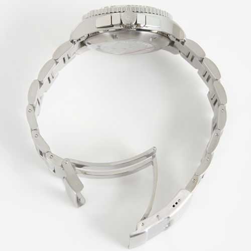 シルバー文字盤に蛍光塗料を施した同色の指針、アラビラとバーのインデックスを配置。12時位置にブランドロゴ、2時位置に1/10秒計、4時位置に日付表示、6時位置にスモールセコンド、10時位置に12時間計を搭載。
