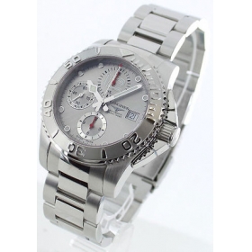 オールシルバーボディにメタリックな文字盤が浮かびデザインブレスで男らしく仕上げたマリンスポーツ ウォッチです。フェイスには12時インデックスの周りに30分計を配し、インダイヤル、レッド針がスピーディなデザインアクセント。蛍光塗料を施したイン デックスや指針は視認性に富み機能的。山型になったプッシュボタンやリューズデザインも特徴的。300m防水220gのアグレッシブに活躍する、カッコい い男を魅せます。
