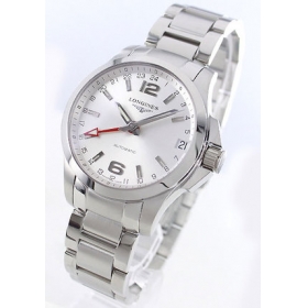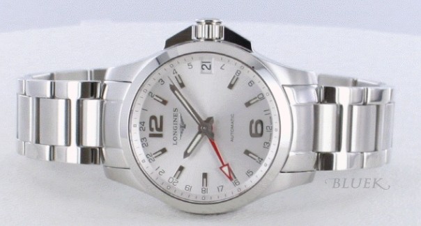 ごついオールシルバーボディの文字盤にレッドのGMT針(世界標準時の事で、2ヶ所の時間を24時間表 示で表示可能な機能)がアクセント、メタリックスタンダードなコンクエストです。光沢が美しいフェイスには12・6時インデックスが目を惹き蛍光塗料を施 したシルバー指針やバーインデックスは視認性に富みます。40mmサイズで185gのずっしりとした存在感が腕元を包み、ビジネスシーンにもピッタリなコ ンクエストです。
