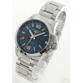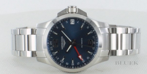 ミラーボ ディにディープブルーの文字盤が浮かび、3連ブレスがジェントルにまとめたコンクエストです。ボリューミーなフェイスは放射状に広がる光沢が美しく、 12・6時のアラビアインデックスやバーインデックス、太い指針が視認性に優れ存在感抜群。リューズガードもしっかりと、日常使いからスーツスタイルまで 最適な時計です。