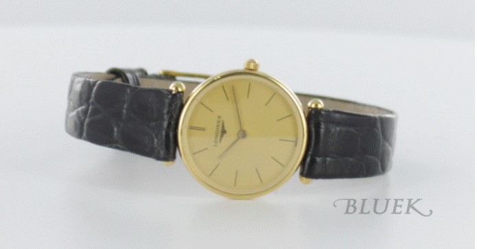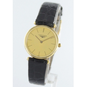 スイスの腕時計老舗ブランドであるロンジン。ラウンドケースが代表的なデザインで、シンプルにこだわっ たすっきりとしたデザインにはロンジンの歴史を感じさせる堂々とした風格が漂うグランドクラシックシリーズ。その中でもめずらしスクエアケース。一切の飾 り気を排除したシンプルなデザインで年齢を問わず着けていただけるベーシックなフォルム。落ち着いた色合いのゴールド文字盤にシンプルなバーインデックス がクラシカルな雰囲気を漂わせます。ベルトにはアリゲーターレザー(ワニ革)を使用。