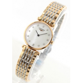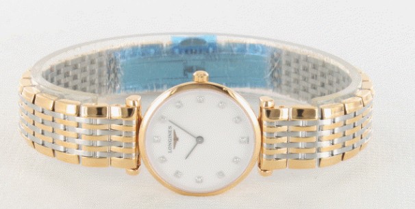 優美なホワイトシェルダイヤルに、12粒のダイヤモンドをセッティングした、非常に豪華なグランドクラ シックです。つややかなピンクゴールドケースと、ピンクゴールド&シルバー9連コンビブレスとの組み合わせも見事で、ダイヤルの美しさをいっそう際立てて います。このどこかクラシカルでエレガントなデザインは、ロンジンの伝統そのもの。ブランド創設時のデザイン特徴を再現し、現代でも色褪せることなく、そ の洗練された魅力と価値をあますところなく伝えています。まさに大人の女性におすすめのブレスウォッチです。