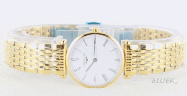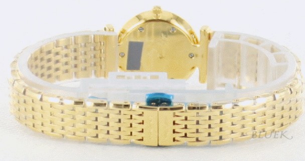 ゴールドケースにホワイト文字盤が浮かび、艶やかな9連ゴールドブレスが華やかクラシカルに仕上げた時計です。フェイスはシンプルにブラックのローマンインデックスと指針のみ、わずか4mmの厚さで45gが軽快にフィット。手元を高貴なオーラで包みます。