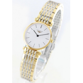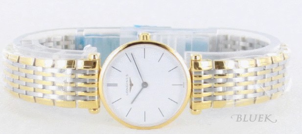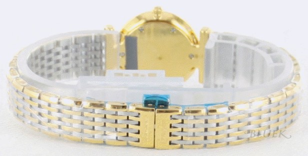ゴールドケースにホワイト文字盤が浮かび、9連コンビブレスが気品クラシカルに仕上げた時計です。フェイスはシンプルにブラックのバーインデックスと指針のみ、わずか4mmの厚さで45gが軽快にフィット。手元を高貴なオーラで包みます。