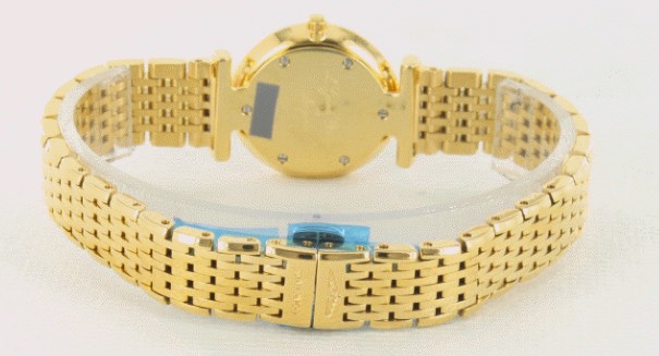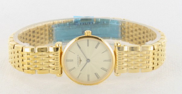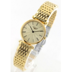 オールゴールドの美しさと、クラシカルな魅力をたっぷり伝えてくれるグランドクラシックです。ロンジン のスタンダードシリーズともいえるこのモデルは、創業時のデザイン特徴を忠実に再現。つややかな光沢を放つゴールドケースに、放射状のギョーシェ模様入り ゴールドダイヤルと、ケースと同じゴールド9連ブレスを組み合わせた、非常に華やかなブレスウォッチです。ダイヤルには細身のブラック指針とローマンイン デックスを配し、スマートでエレガントな表情に。華奢なサイズも女性らしく、しなやかで優美な手元を彩ります。