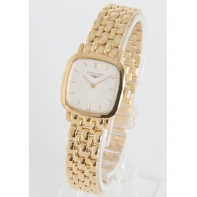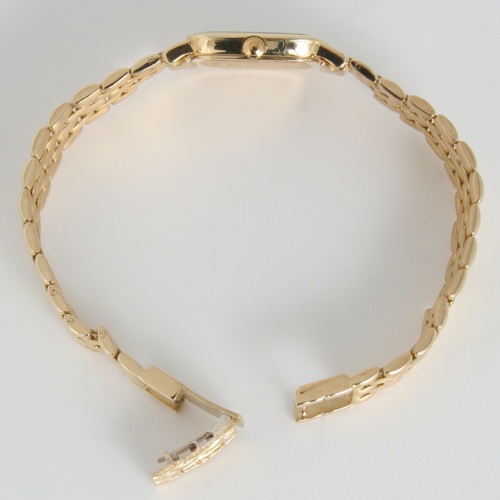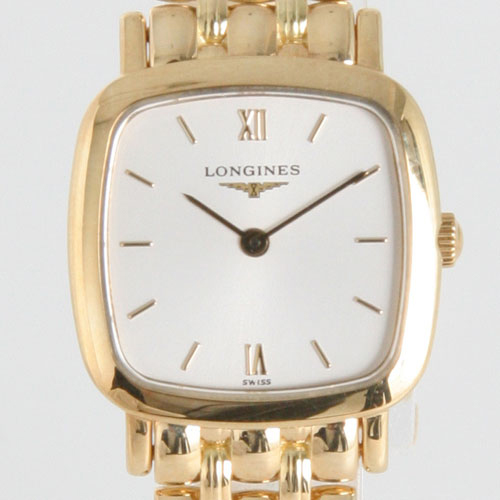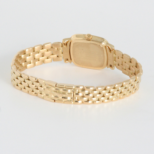 シルバー文字盤にゴールドの指針、ローマンとバーのインデックスを配置。12時位置にブランドロゴ。