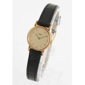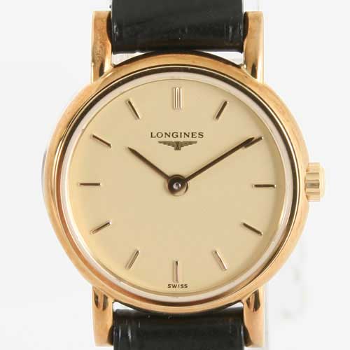 ゴールド文字盤に同色の指針、バーインデックスを配置。12時位置にブランドロゴ。
