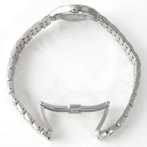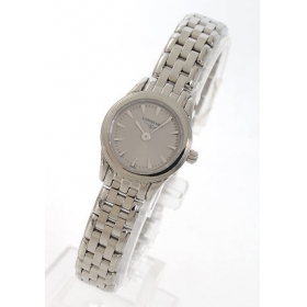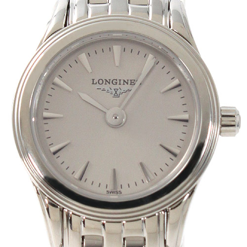 グレー文字盤にシルバーの指針、くさび(トライアングル)インデックスを配置。12時位置にブランドロゴを表示。