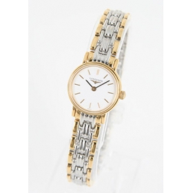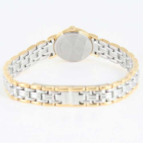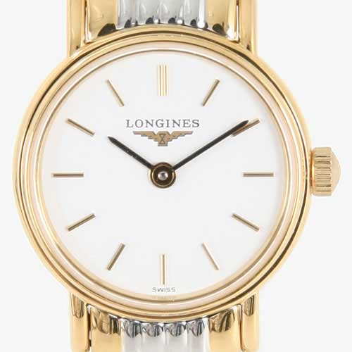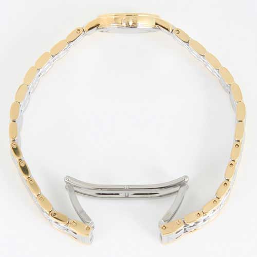 ホワイト文字盤にブラックの指針、バーインデックスを配置。12時位置にブランドロゴ。