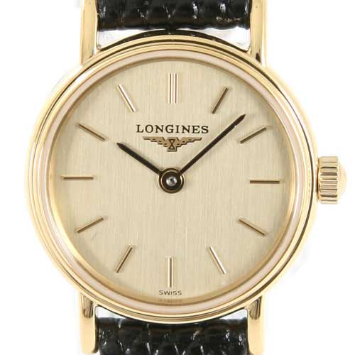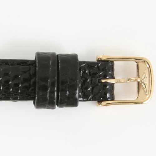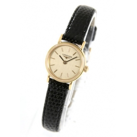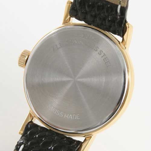 ゴールド文字盤にブラックの指針、バーインデックスを配置。12時位置にブランドロゴ。