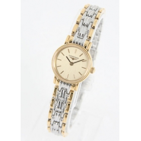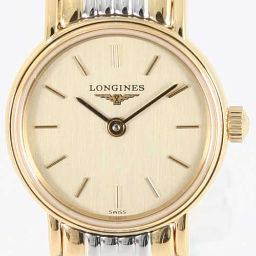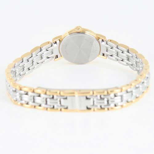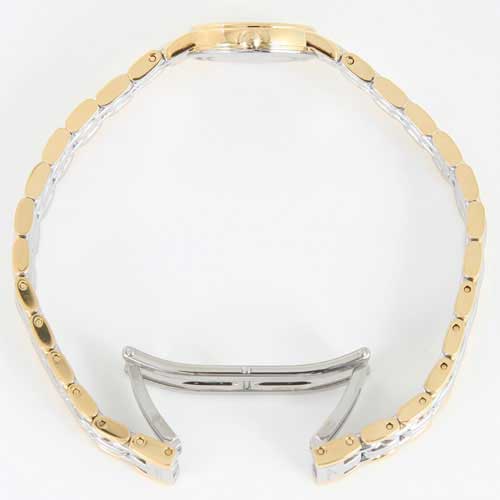ゴールド文字盤にブラックの指針、バーインデックスを配置。12時位置にブランドロゴ。