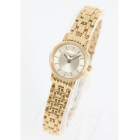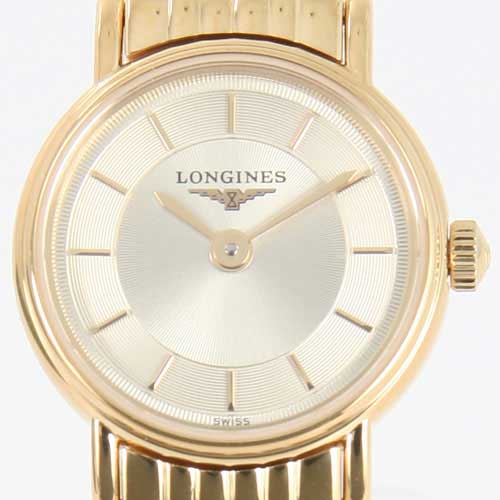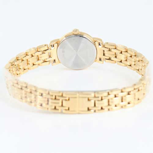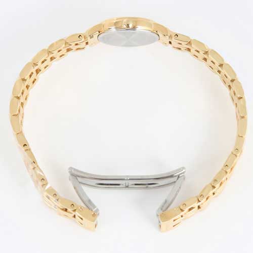 ギョーシェ模様が入ったゴールド文字盤にブラックの指針、バーインデックスを配置。12時位置にブランドロゴ。