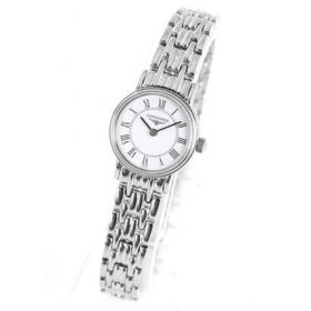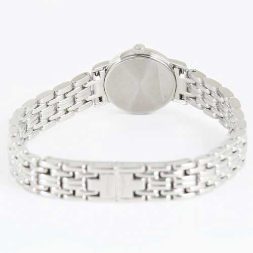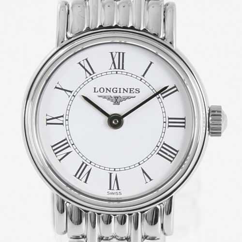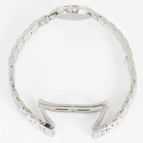 ホワイト文字盤にブラックの指針、ローマンインデックスを配置。12時位置にブランドロゴ。