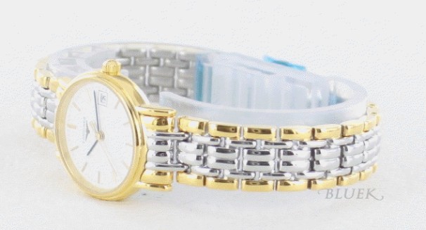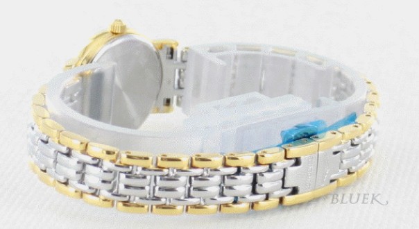 ホワイト文字盤に艶やかな5連コンビブレスが落ち着いた知的スタンダードに仕上げた時計です。フェイス にはシンプルにブラックの指針やゴールドバーインデックスや3時位置の日付表示、わずか6mmの厚さで45gが軽快滑らかにフィット。手元をあでやかクラ シカルなオーラで包みます。