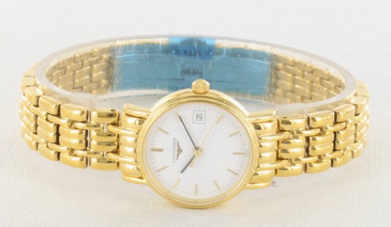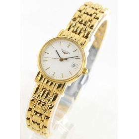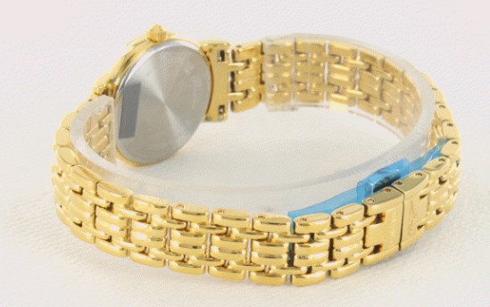 ゴールド好きの女性にはたまらない、非常に華やかなグランドクラシックプレザンスです。つややかな光沢 を放つケースに、ホワイトダイヤルとゴールドの5連ブレスの組み合わせも見事。スリムで軽い23ミリケースながら、ブレスにはボリューム感があり、ゴール ドの輝きと存在感がたっぷり。女性の手元を美しく見せ、ゴージャスな印象を与えてくれます。ダイヤルには細身のゴールドバーインデックスとブラック指針、 そして日付窓を配置。視認性、実用性を確保しつつ、どこまでもスマートでエレガントな雰囲気を漂わせています。