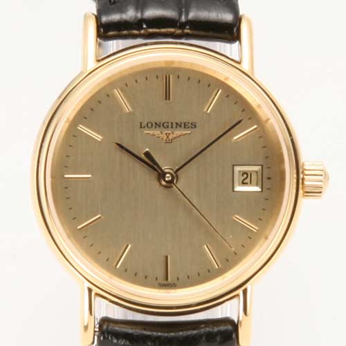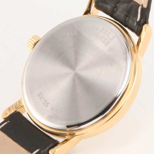 キレイに円を描くベーシックな丸文字盤はゴールドの高級感を嫌味なく上品に見せてくれます。バーインデックスにもゴールドを使う事でスッキリとまとまりのある表情に。3時位置には日付表示もついています。