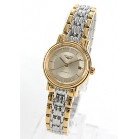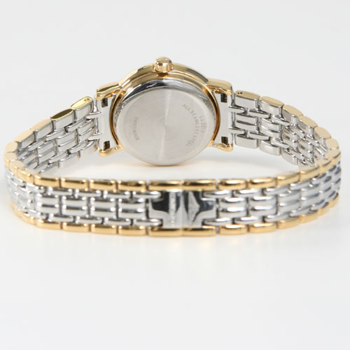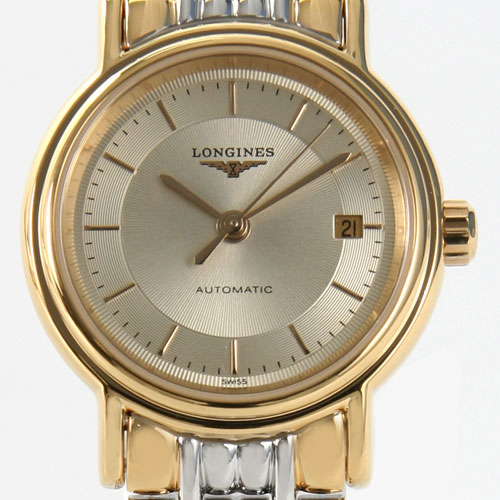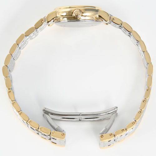 ゴールド文字盤に同色の指針、バーインデックスを配置。12時位置にブランドロゴ、3時位置に日付表示、6時位置にオートマチックであることを示す刻印。