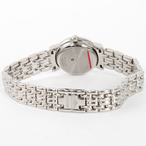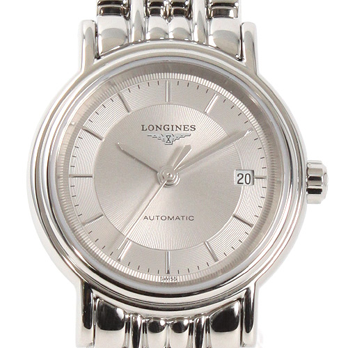 シルバー文字盤に同色の指針、バーインデックスを配置。12時位置にブランドロゴ、3時位置に日付表示を搭載。6時位置にオートマチックであることを示す刻印。