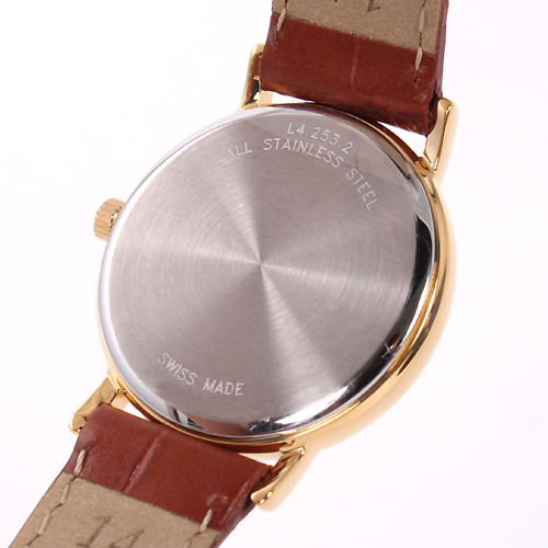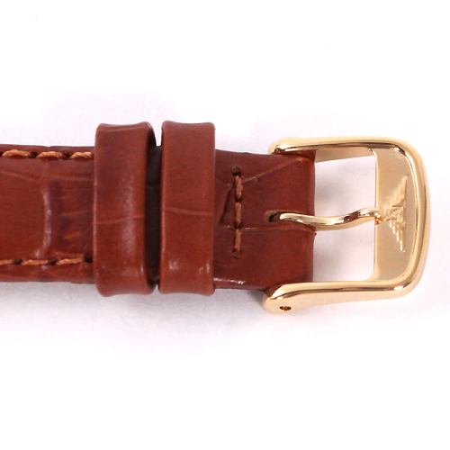 ギョーシェ模様が入ったホワイト文字盤にゴールドの指針、バーインデックスを配置。12時位置にブラン ドロゴ、3時位置に日付表示を搭載。艶ありのゴールドケースに同色のリューズを使用。時間を調節するリューズにはブランドロゴを刻印し、細部にまでこだわ りが感じられます。