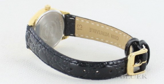 ゴールドのボディにシンプルな同色の文字盤が浮かび、ブラックレザーがあでやかクラシカルに仕上げた時 計です。フェイスでは指針やバーインデックスがキラキラと時を刻み、わずか25mmサイズが軽快滑らかにフィット。普段使いからパーティーシーンまで、美 しい光沢が手元を包みます。