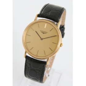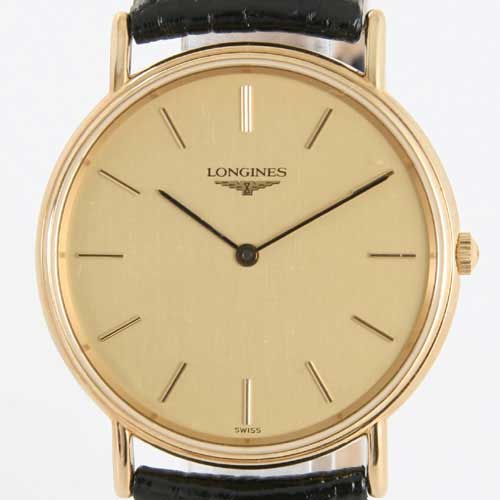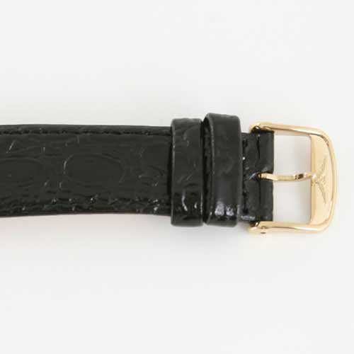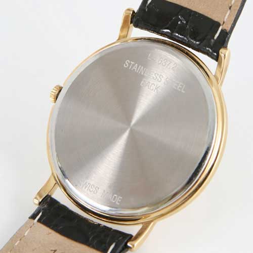 ゴールド文字盤にブラックの指針、バーインデックスを配置。12時位置にブランドロゴ。
