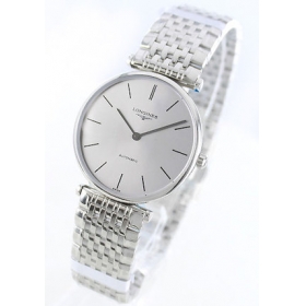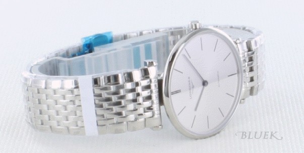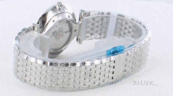 オールシルバーボディに、9連ブレスがシンプルクラシカルな時計です。フェイスはブラックのバーイン デックスと指針のみで視認性に富みます。バックスケルトンでムーブメントの動きを堪能でき、わずか7mmの厚さで80gが軽快にフィット。デザイン全てが スリムで、シャープなフォルムが綺麗。時計としてのみの機能を重視しスーツスタイルにもぴったりなグランドクラシックです。