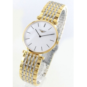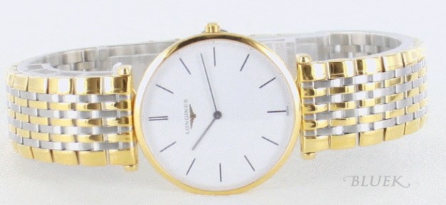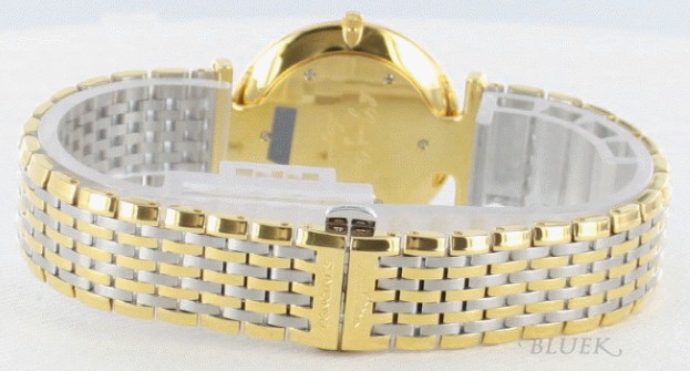 ゴールドケースにホワイト文字盤が浮かび、艶やかな9連コンビブレスが渋く華美な時計です。フェイスは シンプルにブラックのバーインデックスと指針のみで時を刻みます。わずか4mmの厚さで70gが軽快にブレスのフィット感が堪らない。時計のみの機能を重 視しスーツスタイルにもぴったりなグランドクラシックです。