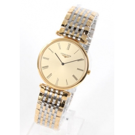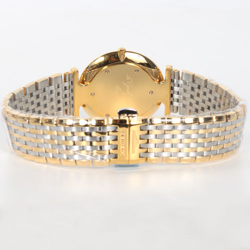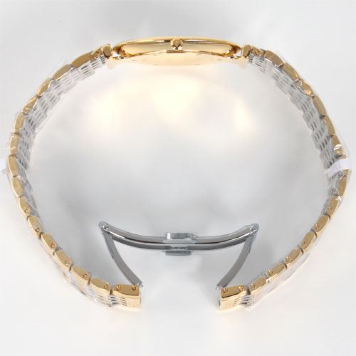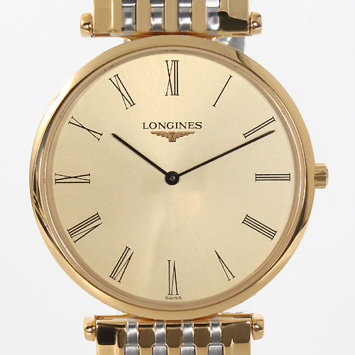ゴールド文字盤にブラックの指針、ローマンインデックスを配置。12時位置にブランドロゴ。