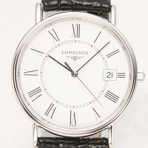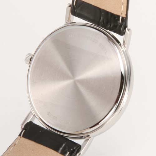 キレイに円を描く丸型フェイスにローマ数字のインデックスでクラシカルな表情に。ホワイトカラーに黒字で描いたデザイン、シンプルを引き立てる色使いで存在感アップ。3時位置には日付表示も付いています。