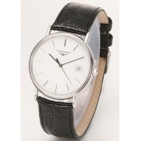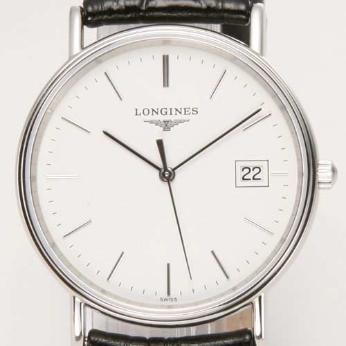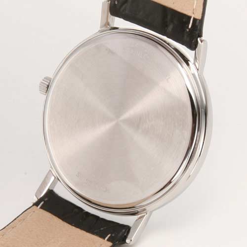 キレイに円を描く丸型フェイスとバーインデックスがベーシックな印象。白地にシルバー、デザイン・カラー共にシンプルですがその中に品格が良く映えます。3時位には日付表示も付いています。