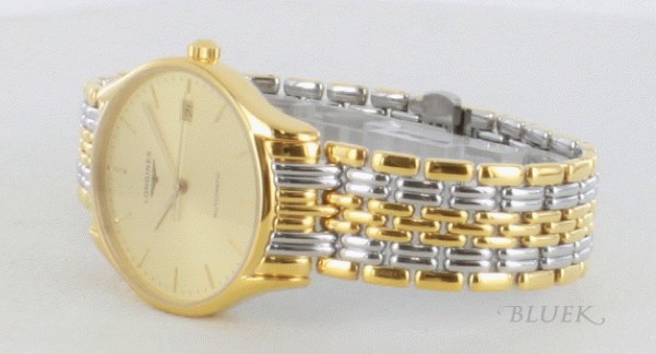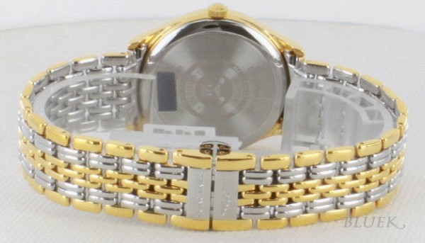 ゴールド文字盤にコマが重なり合った7連コンビブレスがクラシカルで華やかに仕上げた時計です。フェイ スは艶やかなバーインデックスと指針のみで視認性に富みます。わずか7mmの厚さで85gが軽快にフィット。全てがスリムでシャープなフォルムが時計とし てのみの機能を重視し、紳士的なスーツスタイルにもぴったりなグランドクラシックです。