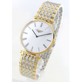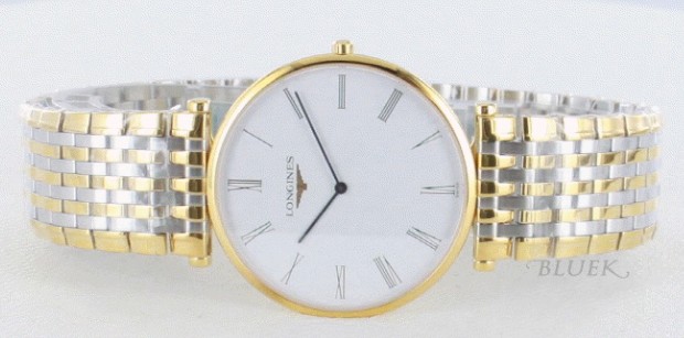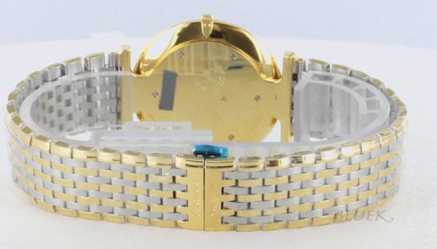 ゴールドケースにホワイト文字盤が浮かび、艶やかな9連コンビブレスが知的スリムな時計です。フェイス はシンプルにブラックのローマンインデックスと指針のみ、わずか5mmの厚さで80gが軽快にフィット。時計のみの機能を重視しスーツスタイルにもぴった りな、手元を高貴なオーラで包みます。