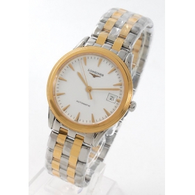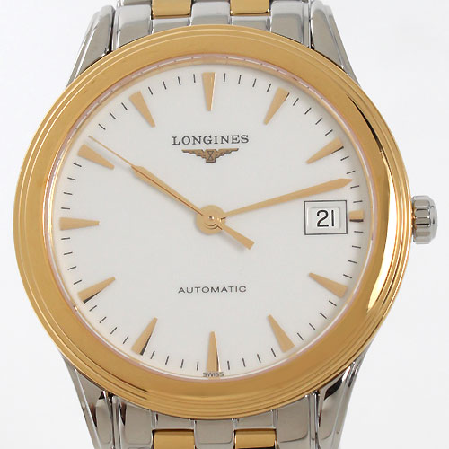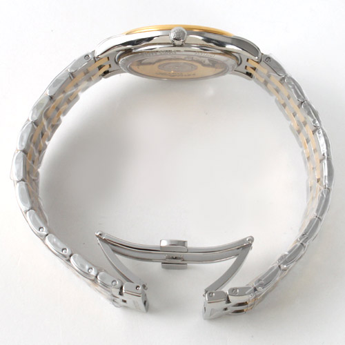 ホワイト文字盤にゴールドの指針、くさび(トライアングル)インデックスを配置。12時位置にブランドロゴ、3時位置に日付表示、6時位置にオートマチックであることを示す刻印。
