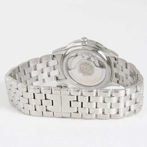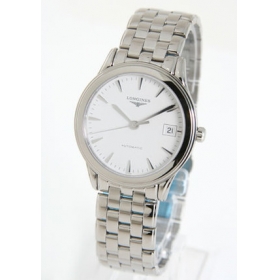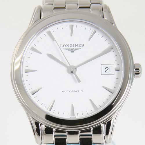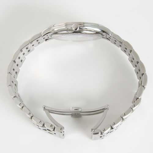 ホワイト文字盤に同色の指針、バーインデックスを配置。12時位置にブランドロゴ、3時位置に日付表示、6時位置にオートマチックであることを示す刻印。